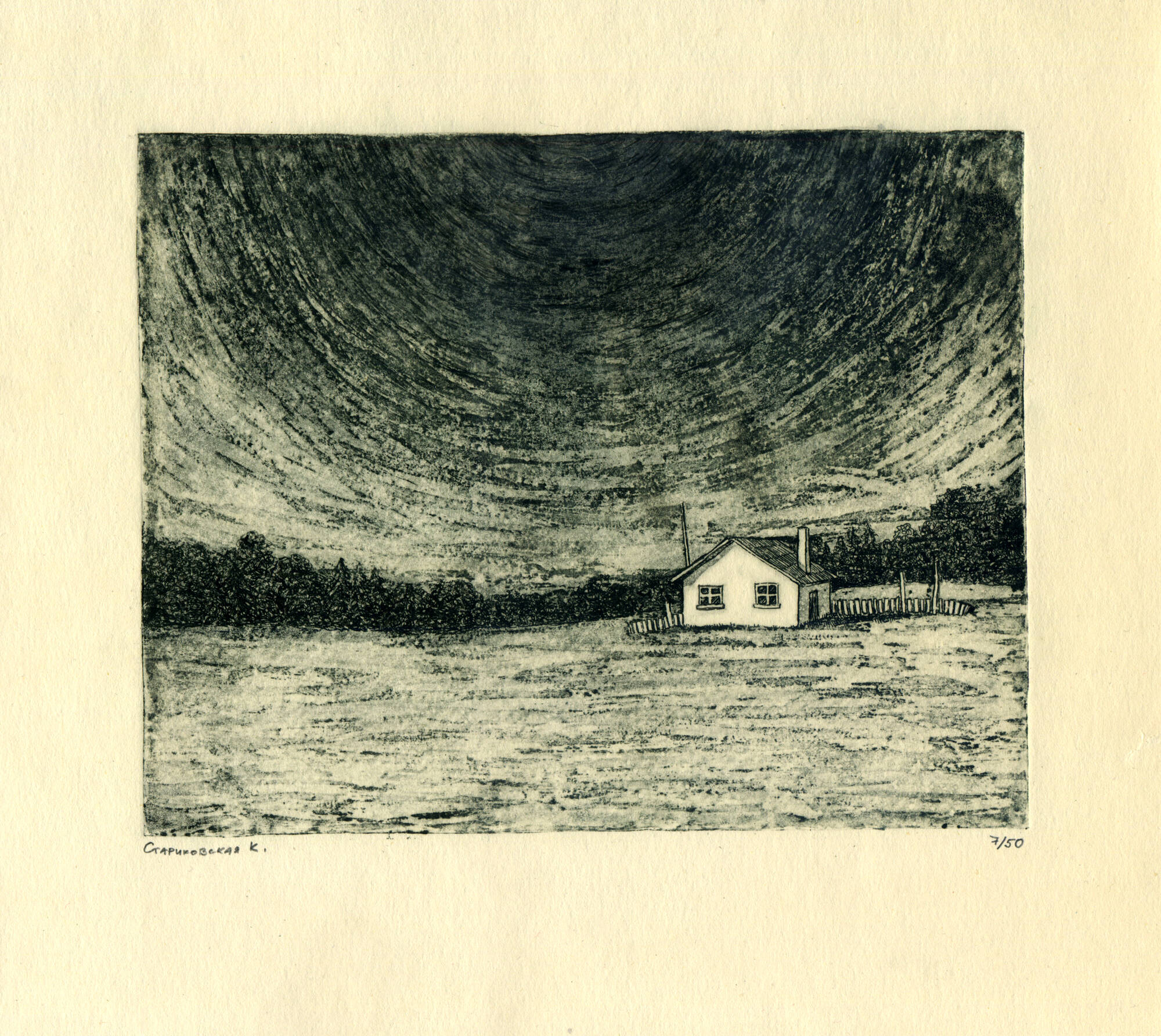 Работа выполнена в технике офорта, глубокая печать, 7/50. Печатная форма создана вручную на медной пластине путём химических травлений (техники - травлёный штрих, акватинта, открытое травление). Каждый оттиск отпечатан автором вручную на офортном станке (валовый пресс) специализированной краской на офортной бумаге. Размер изображения 170х130мм, размер листа 200х229мм