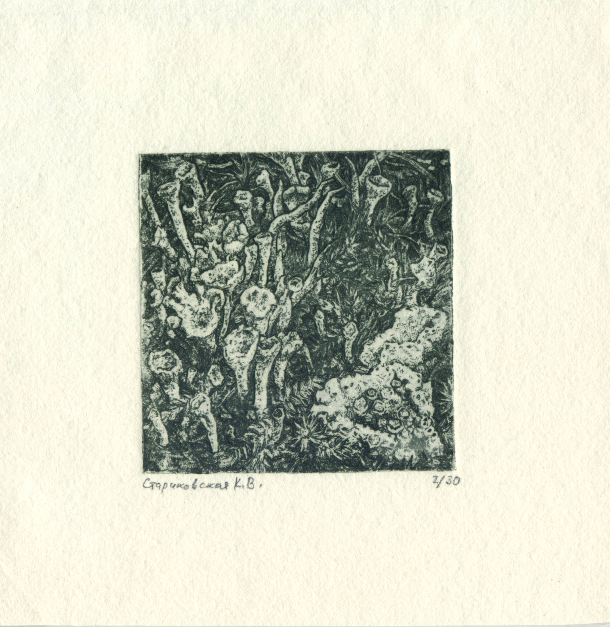 Работа выполнена в технике офорта, глубокая печать, 2/30, 10/30. Печатная форма создана вручную на медной пластине путём химических травлений (техника - травлёный штрих). Каждый оттиск отпечатан автором вручную на офортном станке (валовый пресс) специализированной краской на офортной бумаге. Размер изображения 75х75мм, размер листа 148х151мм (2/30) и 125х123мм (10/30)