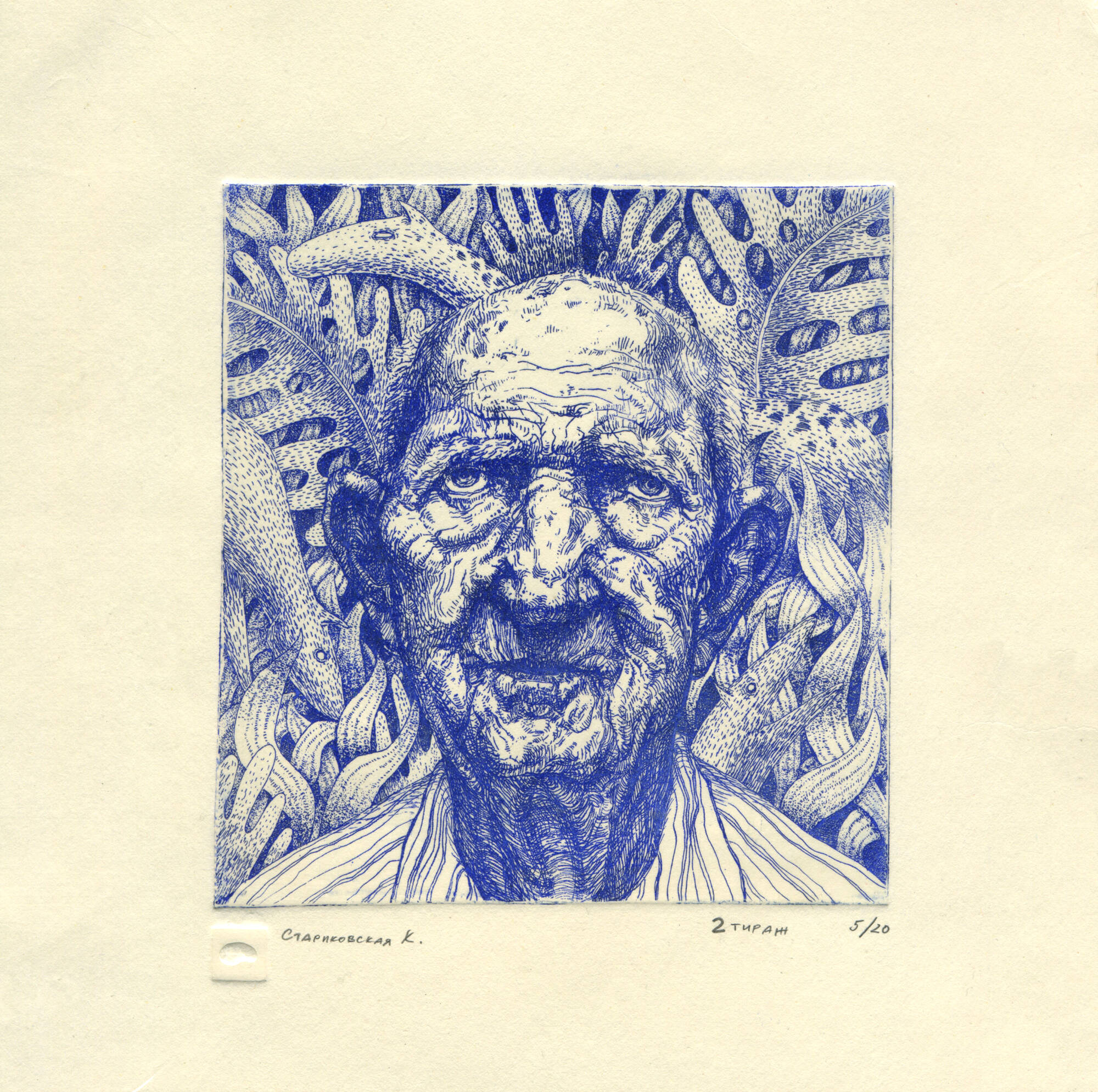 Работа выполнена в технике офорта, глубокая печать, 5/20(2), 10/20 (2). Печатная форма создана вручную на медной пластине путём химических травлений (техника - травлёный штрих). Каждый оттиск отпечатан автором вручную на офортном станке (валовый пресс) специализированной краской на офортной бумаге. Оттиск 10/20(2) иллюминирован акварелью. Размер изображения 110х120мм, размер листа 188х183мм (5/20(2)) и 200х200мм (10/20(2))