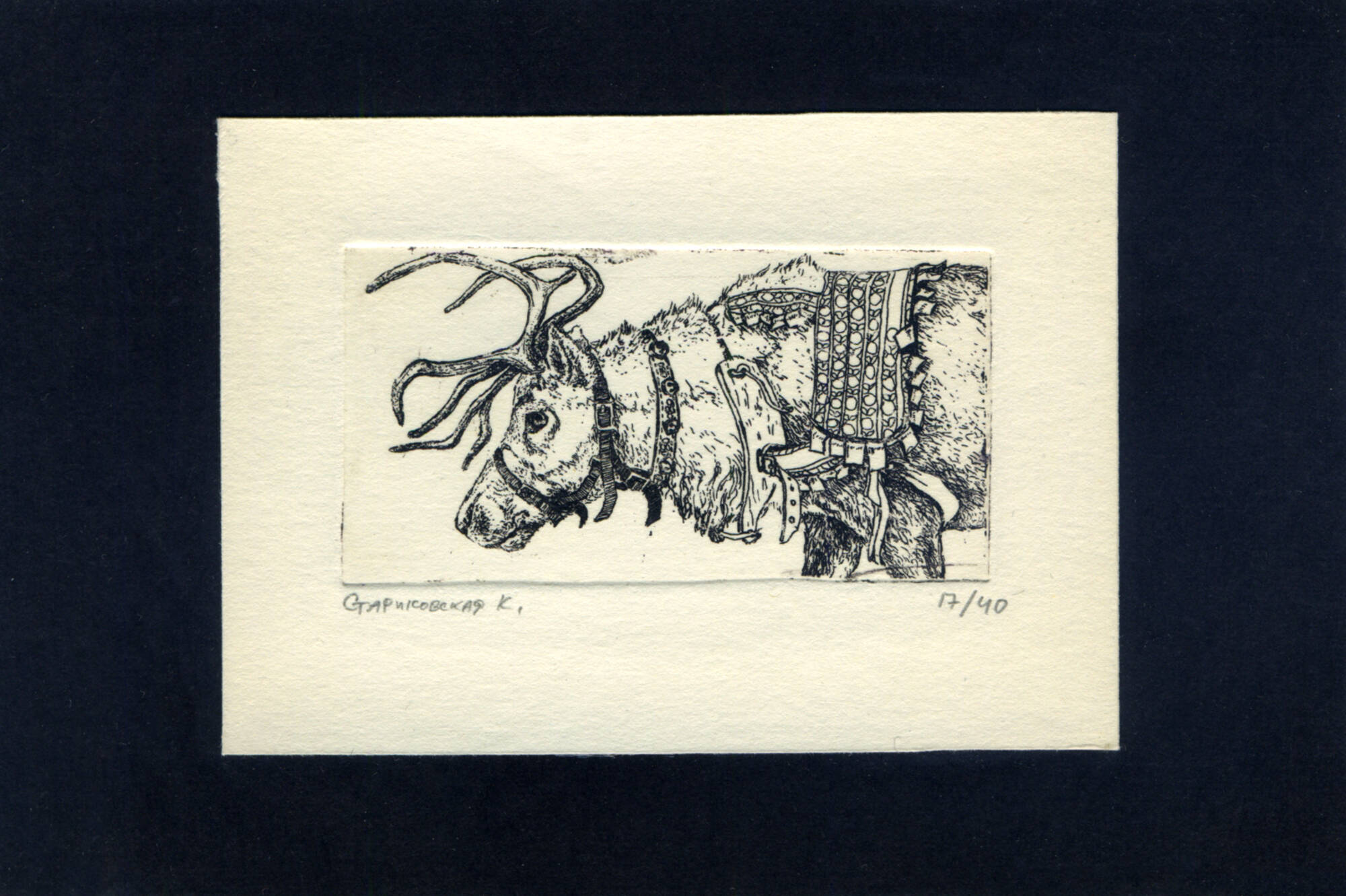 Работа выполнена в технике офорта, глубокая печать, 7/40, 17/40. Печатная форма создана вручную на медной пластине путём химических травлений (техника - травлёный штрих). Каждый оттиск отпечатан автором вручную на офортном станке (валовый пресс) специализированной краской на офортной бумаге, оттиск 7/40 иллюминирован акварелью. Размер изображения 68х35мм, размер листа 90х121мм (7/40) и 70х96 (17/40), дублированы на тонированную бумагу 100х145мм