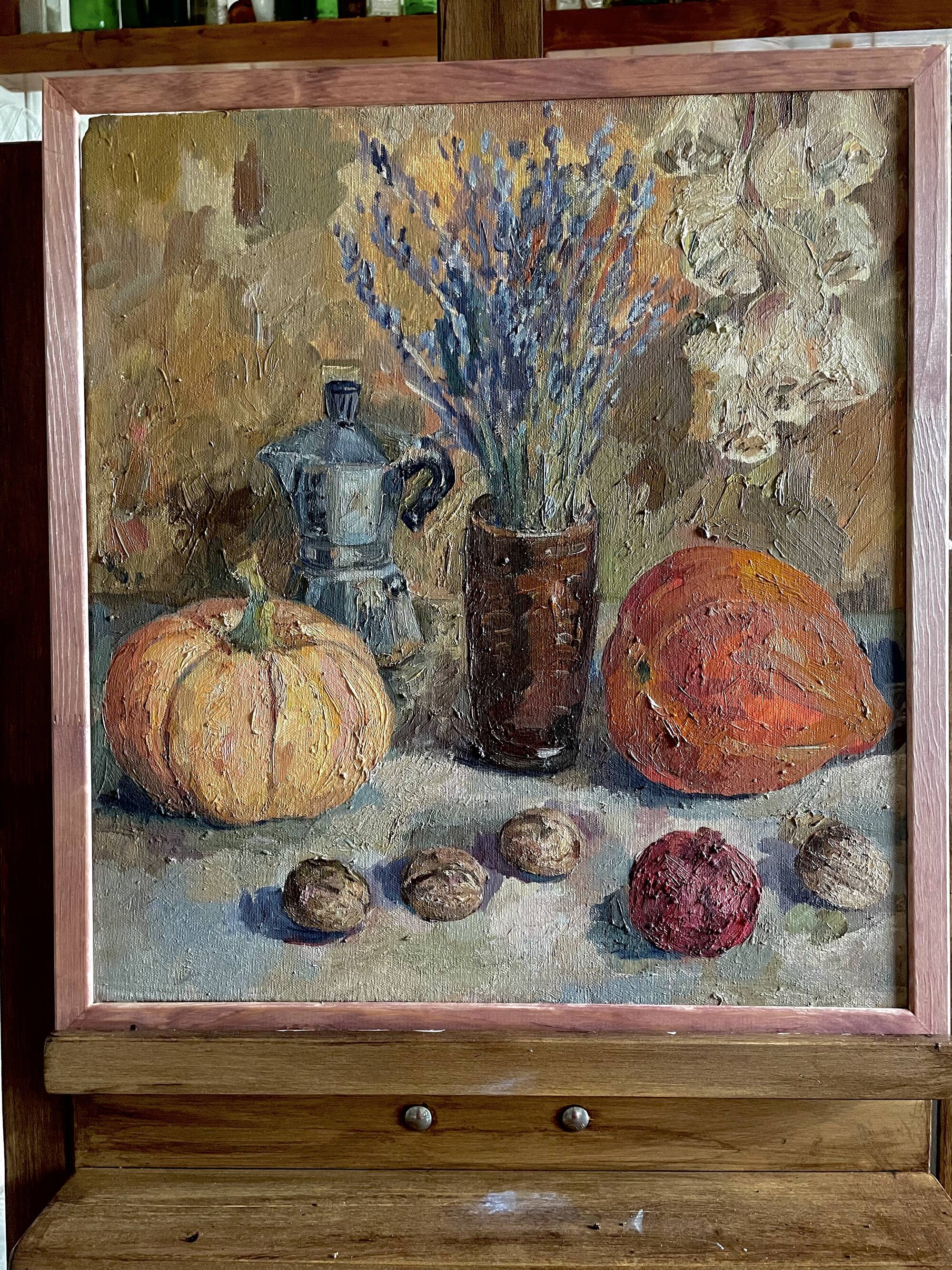 Часто в процессе написания работы, сама живопись меня уводит в ассоциации, мои представления и разных уголках мира. Здесь я отчетливо чувствовала, что пишу про осень в Канаде, в которой я ещё никогда не была, но благодаря живописи, я будто прожила там один свежий и светлый день, с искрящимся воздухом и золотом осени. Этот мой день в Канаде начался с чашки кофе и видом на парк)